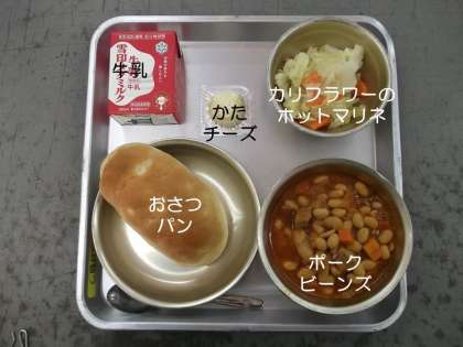 今日の献立は,『ポークビーンズ』『カリフラワーのホットマリネ』『かたチーズ』『おさつパン』『牛乳』です。