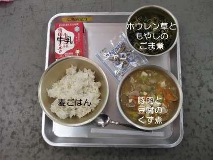 今日の献立,『豚肉と豆腐のくず煮』『ホウレン草ともやしのごま煮』『ジャコ』『麦ごはん』『牛乳』です。