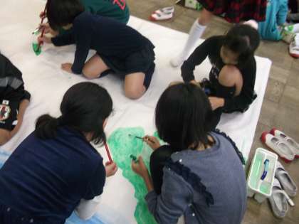 劇で使う小道具や背景などの製作は,みんなで分担して行っています。