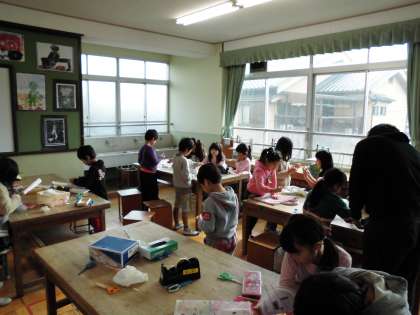 2年2組では,生活科の学習でおもちゃ作りをしています。自分の作りたいおもちゃを作っては遊んで試してみて,また作り直したり修理したり・・という活動をしています。材料を選びながら作ったり,ペットボトルキャップにきりで穴を開けたりしました。作れたら廊下でうまく遊べるか試しました。熱中して活動していたので,終わりの時間が来ると「えっ!?もう終わり?」という子どもたちもいました。