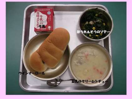 今日の給食は,「牛乳」「ウインナーロール」「豆乳のクリームシチュー」「ほうれん草のソテー」です。