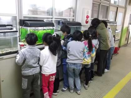 運動場はグランドの状態が悪いので,今日は遊べません。しかし,職員室前の水槽の前にたくさんの子どもたちが集まって,少し大きくなってきた魚やウーパールーパー・イモリなどを楽しそうに見ていました。