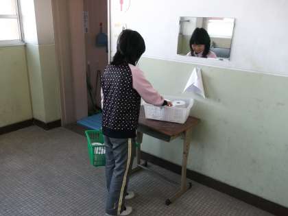 毎日中間休みに,保健委員会の子どもたちは,当番を決めて,手洗い場の石鹸の補充やトイレのトイレットペーパーの補充などをしています。