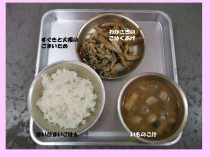 今日の給食は,「胚芽米ごはん」「わかさぎのこはくあげ」「すぐきと大根のゴマ炒め」「いものこ汁」です。