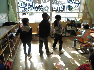 今日は,天気も良くて,みんなの作品に光を当ててみてみたら,とてもきれいな色に輝いて見えました。