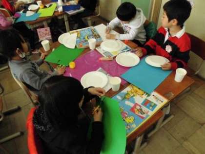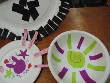 どんな模様やかざりだとコロコロしたり,ゆらゆらしたりすると楽しいかを考えうごかしながら作っています。「ピラピラをつけるとおもしろいよ!」「カラフルだと回るときれいだね」と楽しそうに作っています。