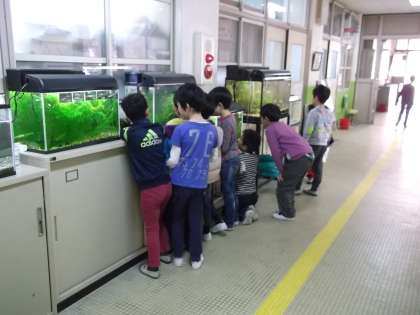 運動場は,昨日の雨の影響で朝は使えませんでした。しかし,職員室前の水槽のところには,たくさんの子どもたちが集まって,水槽の生き物を友だちと見ていました。