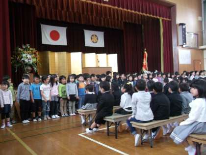 87名の元気な子どもたちが入学しました。今日からは1年生です。しっかり学んで,体を鍛え,たくさんの友達を作ってほしいと思います。校庭の大きなクスノキも,皆さんの入学をお祝いしているようです。