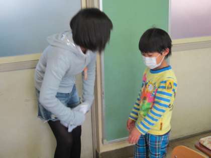 仕事終わりには,給食台の上を片付け,1年生の子たちにエプロンのたたみ方を教えてくれています。