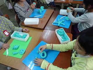 図画工作科の授業で,ねん土をにぎったり,のばしたりして,できた形から,何ができそうか想像を膨らませました。