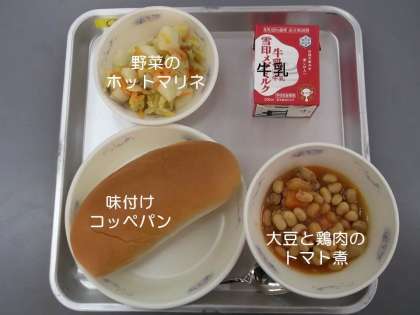 今日の献立は,『大豆と鶏肉のトマト煮』『野菜のホットマリネ』『味付けコッペパン』『牛乳』です。