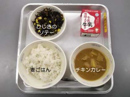 今日の献立は,『チキンカレー』『ひじきのソテー』『麦ごはん』『牛乳』です。