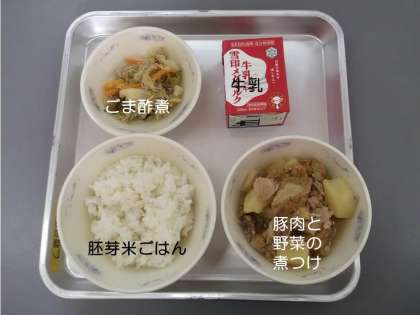 今日の献立は,『豚肉と野菜の煮つけ』『ごま酢煮』『胚芽米ごはん』『牛乳』です。
