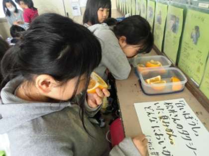 主人公の松井さんがタクシーにのせていた夏みかん。子どもたちに実際に,においをかいでほしいと思い,今日は教室に甘夏みかんを持っていきました。(本当は夏みかんを持っていきたかったのでが,スーパーになく甘夏みかんで代用しました。)子どもたちは,「いいにお〜い!」「さわやかなにおいがする〜!」「食べたいな〜!」と口々に言っていました。よければ,お家でも夏みかんを買って食べてみてください。