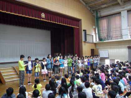 風薫る5月,1年生も交えた全校児童での朝会をしました。