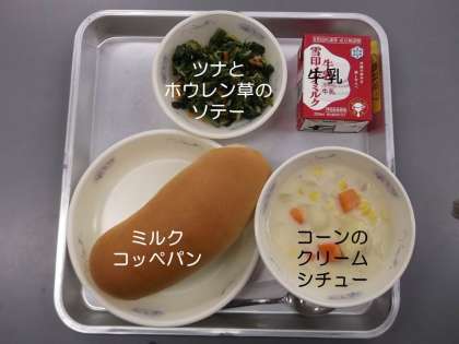 今日の献立は,『コーンのクリームシチュー』『ツナとホウレン草のソテー』『ミルクコッペパン』『牛乳』です。