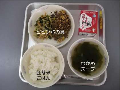今日の献立は,『わかめスープ』『ビビンバの具』『胚芽米ごはん』『牛乳』です。