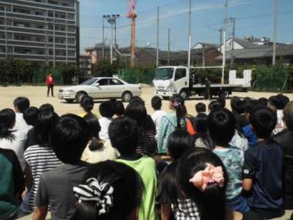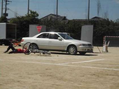 校庭でスタントマンの方が,自転車事故の例を再現してくださいました。