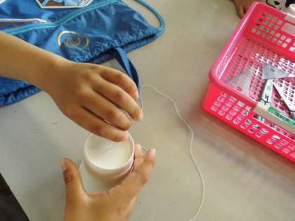 はじめに,糸電話を作りました。糸の張り方を考え,どうしたら音が伝わりやすいかをさぐっていきました。