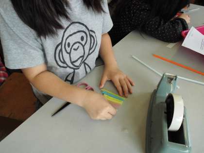 最後に,ストロー笛を作りました。ストローの長さによって音が変わることを使って,ストロー鍵盤を作りました。