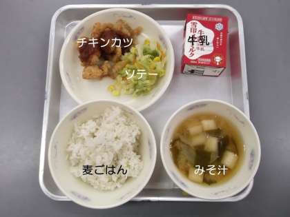 今日の献立は,『みそ汁』『チキンカツ』『ソテー』『麦ごはん』『牛乳』です。