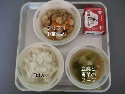 今日の献立は,『豆腐と青菜のスープ』『プリプリ中華炒め』『ごはん』『牛乳』です。