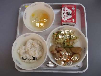 今日の献立は,『玄米ご飯』『平天とこんにゃくの煮つけ』『野菜の梅おかか』『フルーツ寒天』『牛乳』です。