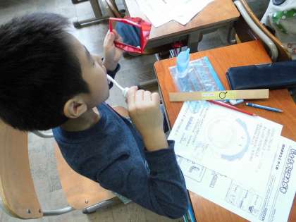 今日の学活の学習では,歯ブラシの正しい持ち方や歯の磨き方を確認した後に歯垢染出し錠をつかって歯の汚れ具合をチェックしました。