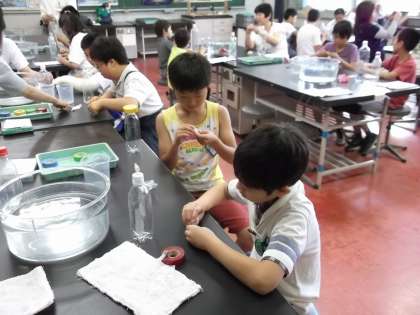 4年生と5年生の二人は,プラネタリウムを見たあと,実験室に入り,持ってきたペットボトルを使って,「浮沈子」の科学工作をしました。