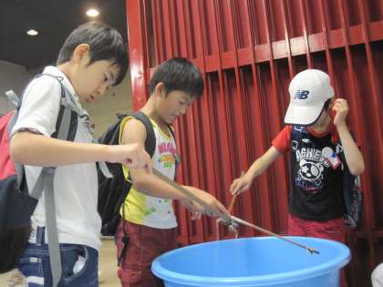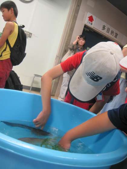 みんなが触れるようにイモリ・コイ・ナマズ・ザリガニを用意していただきました。