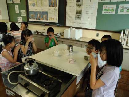 5年生は家庭科の学習でお茶をいれました。そして「だんらん」のひとときをみんなで楽しみました。