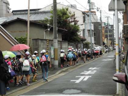 あいにくの曇り空の朝です。でも,6年生の児童は,81名全員が晴れ晴れとした顔つきで出発式に臨んでいました。