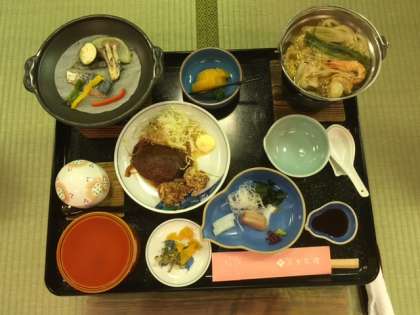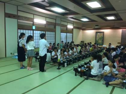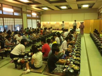 夕食の時間です。大広間で,お膳での食事です。ちょっと大人になった気分ですね。