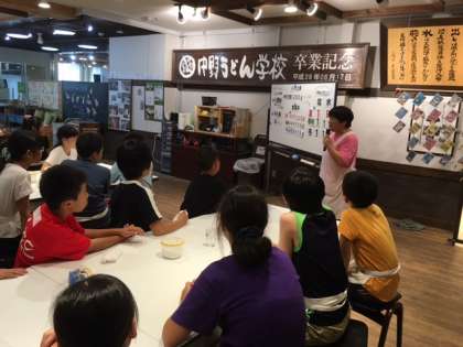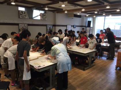 今日の最初の活動は,中野うどん学校で,本場のうどん作りを学びます。
