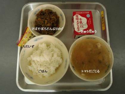 今日の献立は,『ごはん』『さばそぼろどんぶりのぐ』『トマトだごじる』『牛乳』『黒大豆』です。