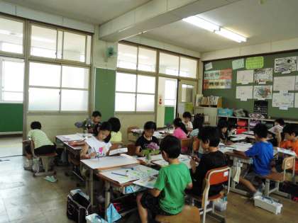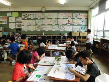今の時期に学校できれいに咲いているあじさい。図画工作科の学習で,絵の具をうまく混ぜ合わせてあじさいを描くことにしました。