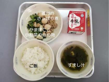 今日の献立は,『ご飯』『すまし汁』『かまぼこと小松菜の炒め物』『鶏肉のさっぱり煮』『牛乳』です。