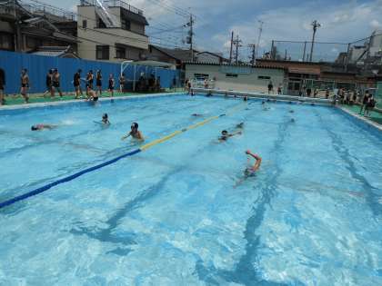 今日も絶好のプール日和でした。今週の金曜にある検定に向けて,今日ものびのびと泳いでいました。ねらい1では,自分のできる泳ぎ方で距離や速さに挑戦しています。また,ねらい2では,今日はクロールだけでなく平泳ぎも取り入れて,練習しました。だんだんと自分の記録を更新できる人も増えてきました。