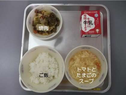 今日の献立は,『ご飯』『トマトとたまごのスープ』『焼肉』『牛乳』です。