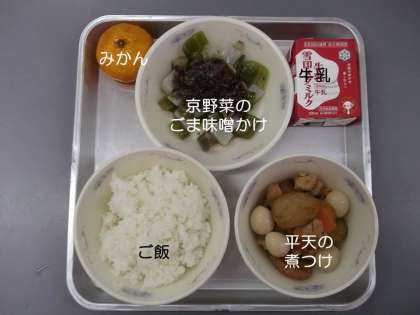 今日の献立は,『ご飯』『平天の煮つけ』『みかん』『京野菜のごま味噌かけ』『牛乳』です。