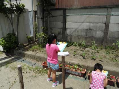 子どもたちは,植えはじめた頃と比べながら,植物の成長に感心していました。