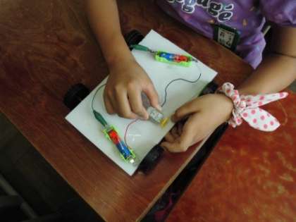車が速く走るための電池のつなぎ方を考えました。並列つなぎより直列つなぎの方が速く走り,電池1この時と並列つなぎの時は同じ速さで走りました。