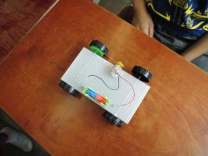 モーターの働きで動く車を作りました。