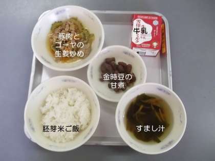 今日の献立は,『胚芽米ごはん』『すまし汁』『金時豆の甘煮』『豚肉とゴーヤの生姜炒め』『牛乳』です。