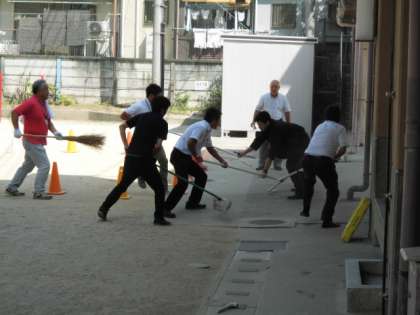 京都府警管区機動隊の方に不審者役をしていただき,対応しました。教職員が児童の生命を守るために,刃物を手にした男に対して,さすまたなどの道具を使って,真剣な模擬格闘訓練をしました。