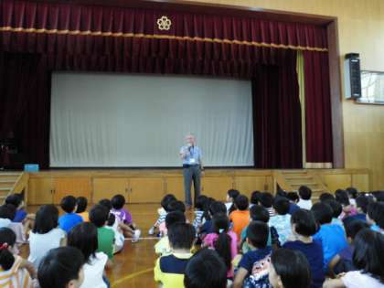 訓練終了後に,体育館で全校児童が下京警察署員の方から不審者から身を守るためにどのようにしたらよいのかなどのお話を伺いました。