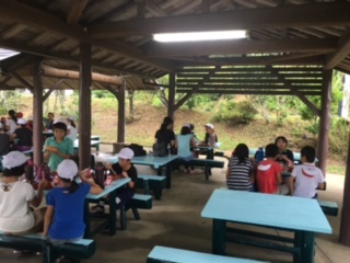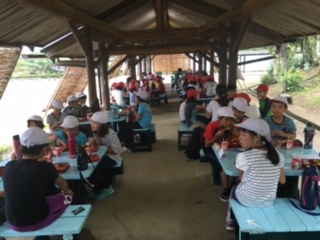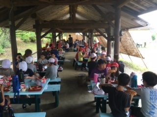 朝食は,みさきの家の中央「芝生広場」にある東屋で食べます。朝からしっかりと食べて,今日も元気に活動をしてくださいね。