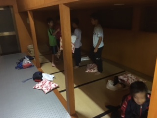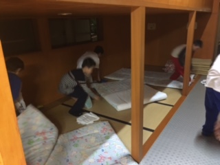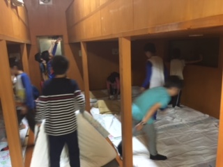 男子は,昨日90畳の大部屋で寝ましたが,今日は,バンガローで休みます。バンガローには,大きな2段ベッドがあります。