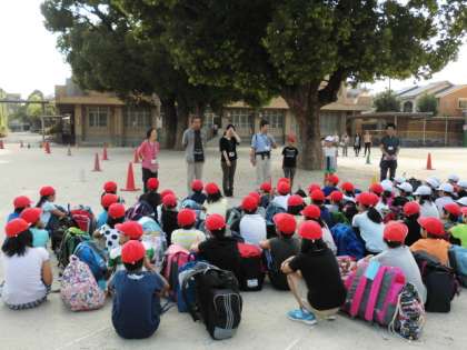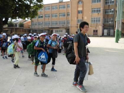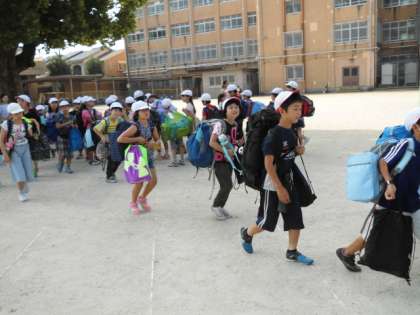 4年生が,今日から2泊3日の予定で,みさきの家での野外活動を行います。7時30分に全員が学校に集合しました。出発式の後,元気よく学校を出発しました。