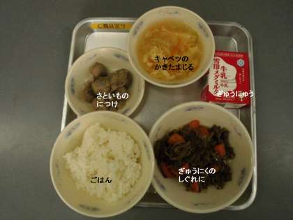 今日の献立は,『ごはん』『牛肉のしぐれ煮』『さといもの煮つけ』『キャベツのかきたま汁』『牛乳』です。
